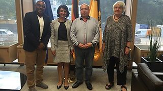 Landtagspräsidentin Muhterem Aras wird am Montag, 29. August 2016, vom „Refugee Radio“ des Freien Radios für Stuttgart zum Thema Situation von Flüchtlingen in Deutschland interviewt. Das Gespräch mit Aras (2.v.li.) führen die beiden Flüchtlinge Sadio Kanouo Frejus Arnaud (li.) aus Kamerun und Abd Almuatin Rajab (2.v.re.) aus Syrien in Begleitung von Sabine Gärttling (re.), die die Flüchtlinge bei ihrem Radioprogramm unterstützt. „Mich begeistert es wirklich sehr, mit wie viel Engagement die Flüchtlinge sich diesem schwierigen Thema annehmen“, betont Aras.