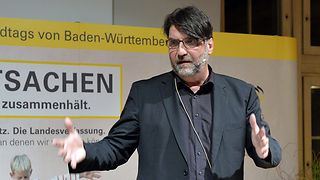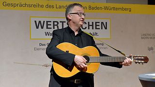 Das Impulsreferat hielt Eberhard Stilz, Präsident des Landesgerichtshofs Baden-Württemberg und Präsident der Stiftung Weltethos. Präsidentin Aras habe mit ihrer „WERTSACHEN“- Reihe ein „Schatzkästlein“ geöffnet, das mit Artikel 1 Grundgesetz (Menschenwürde) ein wertvolles Juwel beherberge. Artikel 4 des Grundgesetzes (Religionsfreiheit), so seine These, sei als „zentrale Ausprägung der Menschenwürde“ ebenfalls ein Edelstein. Stilz formulierte ein scheinbares Paradox: „Freiheiten helfen beim Zusammenhalt.“ Weil Freiheit nie grenzenlos sei, sondern durch andere seien gemeinsame Werte der entscheidende Kitt der Gesellschaft.