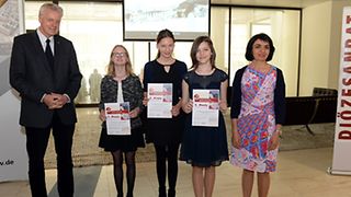 Rahmen die Preisträgerinnen ein: Johannes Warmbrunn, Jury-Mitglied und Diözesanratssprecher und Landtagspräsidentin Muhterem Aras