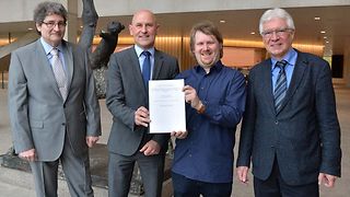v. li.: Ulrich Wesser (Zweit-Prüfer HdM), Landtagsdirektor Frieß, Tobias Heger-Mühlen und Prof. Bernhard Hütter (Erst-Prüfer HdM)