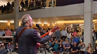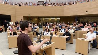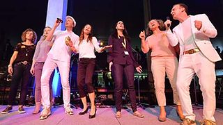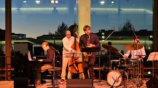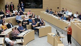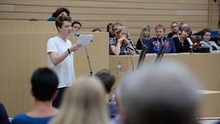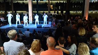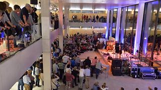 Auf allen Ebenen des Landtags drängten sich die Gäste, vor allem als zeitgleich mehrere Bühnenshows stattfanden. Im Plenarsaal herrschte Vollversammlung, als die drei Poetry Slammer mit ihrer politisch auch mal unkorrekten Wortkunst auftraten. „Die Füenf“ zogen bei jedem ihrer drei Auftritte in der Belle Etage des Landtagsgebäudes Hunderte Fans an. Einige Stücke gab die humorige A-Cappella-Gruppe mit dem Chor des Landtags zum Besten. Die Lacher hatte das Duo „Ernst & Heinrich“ auf ihrer Seite, die mit ihrer urig-schwäbischen Wortgewalt den Poetry-Slammern in nichts nachstanden. Im Bürger- und Medienzentrum liefen bis zwei Uhr am Morgen preisgekrönte Animationsfilme von Studierenden der Filmakademie in Ludwigsburg. Auch wurden die besten Filme des Internationalen Trickfilm-Festivals, das jedes Jahr den Stuttgarter Sommer bereichert, im Bürgerzentrum gezeigt. Und in der Agora spielte die Big Band des Jazzforums Aidlingen unter der Leitung des 85-jährigen Altmeisters Joe Viera. Daneben gab es mit dem Sandi Kuhn Quartett gediegenen Lounge-Jazz am frühen Abend und mit der Band „Wishing Well Classik Rock“ das Nachthupferl. Landtagspräsidentin Aras genoss alle acht angebotenen Programmpunkte: „Unser Landtag war architektonisch wie kulturell ein echtes Highlight und unsere Besucher so vielfältig wie unser schönes und weltoffenes Land.“