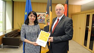 Der Bürgerbeauftragte des Landes Baden-Württemberg, Volker Schindler, übergibt Landtagspräsidentin Muhterem Aras seinen Tätigkeitsbericht für das Jahr 2018. Im Rahmen einer Pressekonferenz stellt er den Bericht am Donnerstag, 23. Mai 2019, der Öffentlichkeit vor.