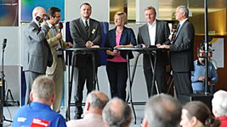 Auf zwei Bühnen sowie an zahlreichen Stationen im und um das Landtagsgebäude präsentierten sich die vier Landtagsfraktionen. Deren Vorsitzende Peter Hauk (CDU), Edith Sitzmann (Grüne), Claus Schmiedel (SPD) und Dr. Hans-Ulrich Rülke (FDP/DVP) trafen auch wieder zum spannenden Schlagabtausch, der „Elefantenrunde“, zusammen (Foto rechts). Bürgerbeteiligung aus Frauensicht wurde ebenfalls erörtert und unter dem Stichwort „Mitmenschen“ plauderten einige Abgeordnete aus dem Nähkästchen und gaben Auskünfte über ihre privaten Hobbys und Engagements.