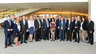 Unser Foto in der Landtagslobby zeigt die Delegationsmitglieder aus der Vojvodina zusammen mit Landtagspräsidentin Muhterem Aras (vordere Reihe, 7. v. l.), dem Parlamentspräsidenten der Vojvodina, István Pásztor (vordere Reihe, 6. v. l.), dem Generalkonsul der Republik Serbien in Stuttgart, Božidar Vučurović (hintere Reihe, 9. v. l.), dem Vorsitzenden des baden-württembergischen Landwirtschaftsausschusses, Martin Hahn (hintere Reihe, 12. v. l.), dem Vorsitzenden des Agrarausschusses der Vojvodina, Nenad Borović (hintere Reihe, 14. v. l.) sowie weiteren Abgeordneten des baden-württembergischen Landwirtschaftsausschusses.