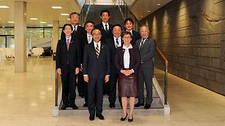 Eine Parlamentarierdelegation der japanischen Präfektur Kanagawa unter Leitung von Hiroyuki Umezawa, Präsident des Präfekturparlaments (4. v. l.), besucht am Dienstag, 12. November 2019, den Landtag von Baden-Württemberg. Die Gäste werden von Landtagsvizepräsidentin Sabine Kurtz zu einem Meinungsaustausch empfangen. Der Besuch in Baden-Württemberg findet statt anlässlich des dreißigjährigen Bestehens der Landespartnerschaft zwischen Baden-Württemberg und Kanagawa. Kanagawa ist mit über neun Millionen Einwohnern nach der benachbarten Präfektur Tokio die bevölkerungsreichste Präfektur Japans. Sitz der Präfekturverwaltung ist Yokohama.