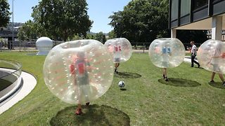 Im Landtag ist in der Tat einiges geboten. Jeder Zentimeter Boden ist beim Bubblesoccer mit den Loopyballs heiß umkämpft. Das Spielmobil lädt zu Geschicklichkeitsspielen aller Art ein. Im klimatisierten Bürger- und Medienzentrum können sich Kinder am Quiz beteiligen oder dem Landeswappen einen neuen Anstrich verpassen. Erfahrene Guides bieten Interessierten Führungen in den - ebenfalls klimatisierten - Plenarsaal an. Für innere Abkühlung sorgen Eiswagen und Getränkestand.