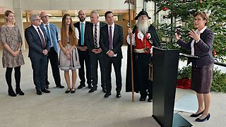 „Traditionen tun uns Menschen gut“, zeigt sich Landtagsvizepräsidentin Sabine Kurtz bei der feierlichen Übergabe des Weihnachtsbaums am Donnerstag, 12. Dezember 2019, überzeugt. Sie ermuntert, während solch traditioneller Momente innezuhalten: „Dann können wir gestärkt und kraftvoll weitergehen, neue Dinge anpacken und umsetzen.“ Sie erinnert in ihrem Grußwort aber auch an die Menschen in all den Ländern, in denen Krieg und Unruhen herrschen und die deswegen nicht innehalten und Besinnlichkeit pflegen können. „Nehmen wir unseren Weihnachtsbaum als Symbol für Frieden und Zusammenhalt“, appelliert Kurtz. „Nutzen wir die Traditionen, die uns unsere christliche Kultur bietet, um über den Alltag und den Tag hinaus zu denken und uns des Lebens zu vergewissern.“