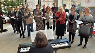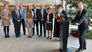 Klaus Mack, Bürgermeister der Gemeinde Bad Wildbad, dankte stellvertretend für seine Amtskollegen aus Enzklösterle und Höfen an der Enz für die Verbundenheit zwischen Land und Kommunen. Die Spende des Weihnachtsbaums sei Ausdruck für diese Verbundenheit. Die Übergabe der Weißtanne wurde musikalisch begleitet durch den Chor des Landtags.