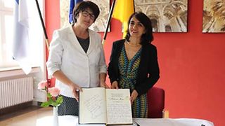 Bei ihrem Besuch in Bruchsal am Mittwoch, 4. Oktober 2017, wird Landtagspräsidentin Muhterem Aras von Oberbürgermeisterin Cornelia Petzold-Schick im Rathaus empfangen. Dort trägt sich Aras ins Goldene Buch der Stadt ein.