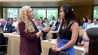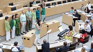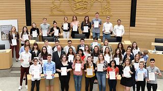49 der Arbeiten, die beim 61. Schülerwettbewerb des Landtags eingereicht wurden, werden mit dem Ersten Preis belohnt. Die ausgezeichneten Schülerinnen und Schüler haben am Donnerstag, 6. Juni 2019, im Landtag von Baden-Württemberg aus den Händen von Landtagspräsidentin Muhterem Aras ihre Urkunden überreicht bekommen. „Das Klischee von der unpolitischen, desinteressierten Jugend ist Unsinn“, zeigte sich die Landtagspräsidentin erfreut. „Junge Menschen machen sich Gedanken um gesellschaftliche Themen und sie denken auch intensiv darüber nach, was wir als Gemeinschaft besser machen sollten.“ Die prämierten Arbeiten wären dafür der beste Beweis. Diese zeigten auch die Vielfalt der Themen, mit denen sich junge Menschen beschäftigen würden. Jedoch hätten sie häufig das Gefühl, die Politik nehme ihre Themen nicht ausreichend wahr. Daran müsse die Politik arbeiten, so Aras, und die Inhalte der Politik stärker an den Zukunftswünschen und Vorstellungen junger Menschen orientieren. „Um in einen Austausch auf Augenhöhe zu kommen, ist der Schülerwettbewerb ein guter Ausgangspunkt“, erklärte die Landtagspräsidentin.