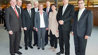 Gruppenbild in der Landtagslobby mit dem Präsidenten des Bundesverfassungsgerichts Prof. Dr. Andreas Voßkuhle (2.v.r): SPD-Fraktionsvorsitzender Claus Schmiedel, FDP/DVP-Fraktionsvorsitzender Dr. Hans-Ulrich Rülke, Landtagspräsident Guido Wolf, Ministerpräsident Winfried Kretschmann, Grünen-Fraktionsvorsitzende Edith Sitzmann, Landtagsvizepräsident Wolfgang Drexler, Landtagsvizepräsidentin Brigitte Lösch sowie CDU-Fraktionsvorsitzender Peter Hauk (v.l.n.r.)