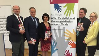 An der Vorstellung des Aktionsplans "Offen für Vielfalt und Chancengleichheit - Ansporn für alle" nimmt Landtagspräsidentin Muhterem Aras (3. v. li.) am Freitagabend, 3. Februar 2017, in Mannheim teil. "Auf dem Boden des Grundgesetzes haben Zivilgesellschaft, Politik und Wirtschaft diese Republik über die Jahrzehnte vielfältig, lebenswert und konkurrenzfähig gemacht. Und dabei haben wir unsere Werte wie Respekt, Gleichheit, Offenheit, Meinungsfreiheit, Chancengerechtigkeit und Religionsfreiheit gestärkt", betont Muhterem Aras. Fast wie nebenbei sei eine lebendige Einwanderungsgesellschaft geschaffen worden, auch wenn es bis heute kein modernes Einwanderungsgesetz gebe. "Dieser starke und über viele Jahrzehnte erarbeitete Grundkonsens hat eine selbstbewusste und freiheitliche Gesellschaft mit starken politischen Strukturen entstehen lassen", führt Aras aus.