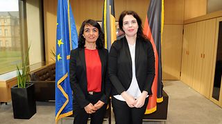 Die Generalkonsulin des Staates Israel in München, Sandra Simovich (re.), kommt am Mittwoch, 17. Januar 2018, zu ihrem Antrittsbesuch in den Landtag von Baden-Württemberg. Landtagspräsidentin Muhterem Aras empfängt sie in ihrem Amtszimmer. Im Gespräch bekräftigte die Präsidentin unter anderem, wie wichtig ihr die Pflege der Erinnerungs- und Gedenkkultur für den gesellschaftlichen Zusammenhalt sei. Die Aufgabe, sich Fremdenfeindlichkeit und insbesondere Antisemitismus entgegenzustellen, werde eher größer als kleiner. Auch Menschen, die neu bei uns lebten, müsse dieses Erinnern als Teil der Geschichte unseres Landes nahegebracht werden, so Aras.