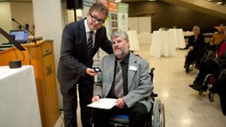 Wolf drückt seine große Bewunderung aus für die Betroffenen, die ihrem schweren Los trotzen und sich überdies dem Kampf gegen die Krankheit widmen. Einer dieser Betroffenen ist der Sprecher des Landesverbands Baden-Württemberg des Bundesverbands Poliomyelitis, Siegfried Spliesgart aus Stuttgart. Er erhält aus den Händen von Guido Wolf die Staufermedaille in Silber. Bei der Staufermedaille handelt es sich um eine persönliche Auszeichnung des Ministerpräsidenten, die als Dank und Anerkennung für besondere Verdienste um das Land Baden-Württemberg vergeben wird.