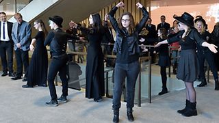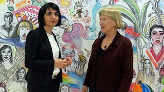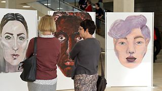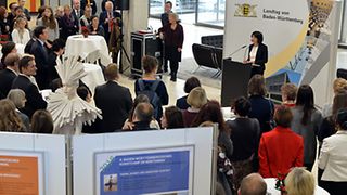 „Eine Woche lang haben sich die Jugendlichen im KunstCamp Baden-Württemberg in Nürtingen künstlerisch mit dem Thema Identität beschäftigt“, erläutert Landtagspräsidentin Muhterem Aras (am Rednerpult) in ihrem Grußwort anlässlich der Ausstellungseröffnung „Das KunstCamp - Zeichnung, Malerei, Keramik, Skulptur, Textildesign, Theater“ am Mittwochmittag, 30. November 2016, im Landtag von Baden-Württemberg. „Es ist einfach schön zu sehen, was begabte junge Menschen alles erschaffen können.“