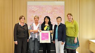 Besuch vom Landesfrauenrat am Donnerstag, 26. April 2018, dem „Girl’s Day“. „Wir geben nicht auf, eine Wahlrechtsreform bleibt auf der Agenda“, bringen die Vorstandsfrauen als Botschaft an Landtagspräsidentin Muhterem Aras (Grüne) mit. Diese bedauert die vertane Chance, das Wahlrecht zu ändern. "Eine Reform des Landtagswahlrechts wäre ein mögliches Instrument gewesen, eine deutliche Botschaft in Sachen Gleichberechtigung und breite gesellschaftliche Repräsentanz auszusenden", unterstreicht Aras das Anliegen der Frauen. Von links aus dem LFR-Vorstand: Corinna Schneider, die Erste Vorsitzende Charlotte Schneidewind-Hartnagel, die Wissenschaftlerin Prof. Dr. Monika Barz sowie die zweite Vorsitzende Saskia Ulmer.