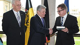 Als Gastgeschenk überreicht Landtagspräsident Guido Wolf (r.) dem Bundespräsidenten Gauck (Bildmitte) u.a. das mit Widmung versehene Buch „Orte des Gedenkens und Erinnerns in Baden-Württemberg“. Links im Bild Ministerpräsident Winfried Kretschmann.
