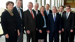 Gruppenbild im Landtag: Bundespräsident Joachim Gauck (3.v.r.) und Landtagspräsident Guido Wolf, CDU-Fraktionsvorsitzender Peter Hauk, Landtagsvizepräsident Wolfgang Drexler, Grünen-Fraktionsvorsitzende Edith Sitzmann, Ministerpräsident Winfried Kretschmann, SPD-Fraktionsvorsitzender Claus Schmiedel, FDP/DVP-Fraktionsvorsitzender Dr. Hans-Ulrich Rülke sowie Landtagsvizepräsidentin Brigitte Lösch (v.r.n.l.)