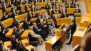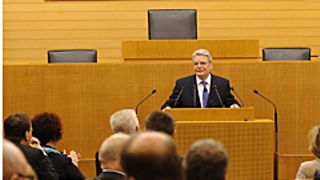 Als erstem Landesparlament macht Bundespräsident Joachim Gauck am Donnerstag, 19. April 2012, dem Landtag von Baden-Württemberg seine Aufwartung. „Dass Sie im Stuttgarter Landtag den Auftakt machen, ehrt uns anlässlich des 60-jährigen Landesjubiläums besonders“, sagt Landtagspräsident Guido Wolf (CDU) bei der Begrüßung des Staatsoberhaupts im Plenarsaal (Foto unten rechts). Im Anschluss spricht der Bundespräsident zu den Abgeordneten und Gästen (Foto unten links).
