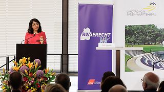 Landtagspräsidentin Muhterem Aras begrüßt die Gäste und verweist dabei auf den Geburtstag des Grundgesetzes am 23. Mai 1949. "Es ist kein Zufall, dass nicht nur das Grundgesetz nächstes Jahr 75 wird, sondern auch der DGB. Gewerkschaften vertreten ein urdemokratisches Anliegen: Nämlich die Lebenssituation aller zu verbessern – und auch für diejenigen einzustehen, die nicht zu den Privilegierten gehören", so die Landtagspräsidentin. "Gerade weil Gewerkschaften einen Blick dafür haben, wo Nachbesserungsbedarf besteht; gerade weil sie sich engagieren und einbringen, sind sie in meinen Augen ein Beispiel für demokratisches Engagement. Ich bin überzeugt, dass sie über ihre Mitglieder in der breiten Bevölkerung Demokratie vermitteln und darauf Lust machen können."