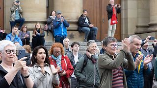 Das Fest zum Verfassungsjubiläum beginnt mit einem Lunchkonzert im Foyer I. Rang des Opernhauses. "Dieses Opernhaus ist ein internationaler Ort, ein Ort der Kunst und damit auch ein Ort der Vielfalt und Freiheit. Ein solcher Ort ist ideal, um unser Grundgesetz zu feiern", freut sich Landtagspräsidentin Muhterem Aras. Cellisten des Staatsorchesters Stuttgart präsentieren Musik-Highlights aus Klassik, Pop und Oper in mitreißenden Arrangements. Neben Aras begrüßt der Intendant der Staatsoper Stuttgart, Viktor Schoner.
