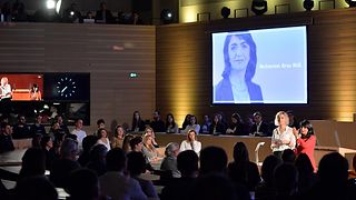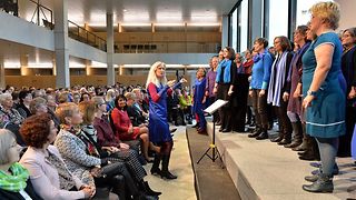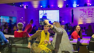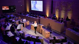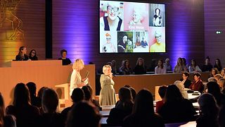 Eine multimedial beeindruckende Performance boten Studierende des Studiengangs Medienwirtschaft an der Hochschule der Medien. Im Plenarsaal inszenierten die Studierenden im Rahmen einer CONMEDIA-Produktion („content in media“) wie es sich anfühlt, wenn im Parlament ein Geschlecht weitgehend dominiert. Im Planspiel, das das Rund des Plenums in lila Licht tauchte, saßen zunächst nur Frauen , sie sprachen über Schönheitsmuster, Selbstbewusstsein und Selbstverständnis. "Traut Euch etwas zu", ermunterte Landtagspräsidentin Aras das weibliche Auditorium. Flankiert wurde die „Experimentierdemokratie“ durch Video-Interviews mit allen frauen-politischen Sprecherinnen der Fraktionen im Landtag sowie einer Umfrage unter Kindern zu ihrem Rollenverständnis. Die Resonanz auf das Angebot des Landtags zu 100 Jahre Frauenwahlrecht fiel beeindruckend aus: Mehr als 500 überwiegend weibliche Gäste kamen am Nachmittag und gut 700 Teilnehmerinnen und Teilnehmer am Abend zur CONMEDIA - und es gab so viele Anmeldungen, dass Interessierte abgewiesen werden mussten. Das habe es in 18 Jahren CONMEDIA nie gegeben, so Moderatorin Carolin Leßmann.