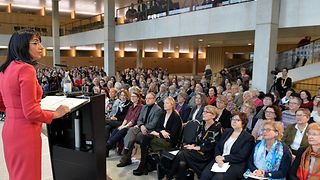 Unter dem Titel „Herrengedeck und Frauengedöns“ beleuchteten Landesfrauenrat, der Verein Frauen und Geschichte sowie Studierende der Hochschule der Medien diesen Jahrestag historisch, gesellschaftspolitisch und auf kreativ-fiktionale Art. „Vor 100 Jahren überwand die Demokratie ihren Geburtsfehler: Den Ausschluss der Frauen aus der Politik“, sagte Landtagspräsidentin Muhterem Aras (Grüne). „Heute geht es um nicht weniger als die Einlösung des Verfassungsversprechens auf Gleichberechtigung und die Beseitigung bestehender Nachteile“, sagte die gastgebende Landtagspräsidentin Muhterem Aras in ihrer Begrüßung. Sie entwickelte die Idee, erst Mann und Frau zusammen könnten auf demokratische Weise in Parlamenten - egal auf welcher föderalen Ebene - die Gesellschaft repräsentieren. "Seit 100 Jahren besteht die Möglichkeit, die Parlamente paritätisch, also ausgewogen mit Männern und Frauen zu besetzen, seit 100 Jahren haben wir das nicht ein einziges Mal geschafft - das muss sich endlich ändern!"