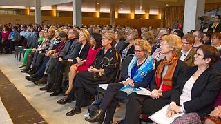 Mit reichlich Beifall bedacht waren auch die Vorträge von Professorin Doris König, Richterin am Bundesverfassungsgericht, sowie Professorin Sylvia Schraut, Vorsitzende des Vereins Frauen und Geschichte. König lenkte den Blick auf das 1948/49 ausgearbeitete und mit dem Recht auf Gleichberechtigung versehene Grundgesetz. Auf dessen Basis erst hätten nach und nach frauendiskriminierende Vorschriften durch das Bundesverfassungsgericht abgeschafft werden können. „Es lohnt sich, den Weg zu einem Parité-Gesetz weiter zu verfolgen“, appellierte König in Stuttgart an das Durchhaltevermögen von Frauen. Besonders viel Applaus gab es für ihr Zitat der früheren CDU-Bundestagspräsidentin Rita Süssmuth: "Ich finde ganz entscheidend, dass Frauen nicht einknicken und versichern: 'Ja, wir sind geduldig, wir machen keinen Ärger' Ich kann nur sagen: Das Bravheits-Gebot ist völlig untauglich. Es geht nicht ohne harte politische Auseinandersetzungen."