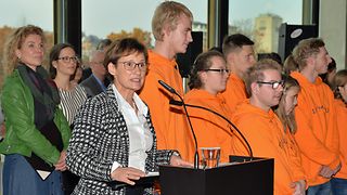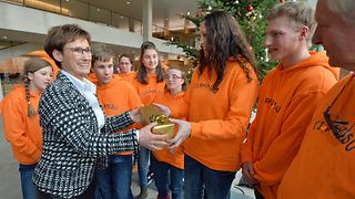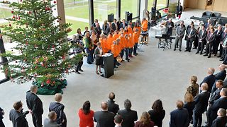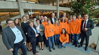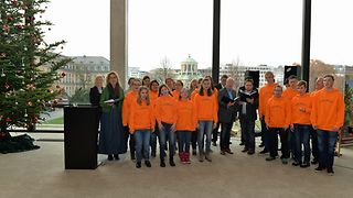 Anlässlich der traditionellen Weihnachtsbaumübergabe sind neben Vertretern Bad Wildbads auch Vertreter der Gemeinden Enzklösterle und Höfen im Haus des Landtags zu Gast. Der Landtagschor unter der Leitung von Angelika Rau-Čulo und der Chor Tiramisu der Klosterbergschule Sonderpädagogisches Bildungs- und Beratungszentrum Schwäbisch Gmünd, der von Heike Bareiß geleitet wird, sorgen für stimmungsvolle, musikalische Umrahmung.