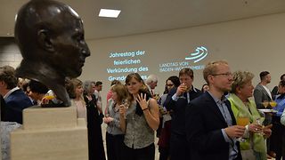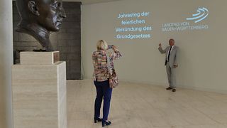 Geburtstagsfeier für das Grundgesetz: Rund 550 Gästen kommen am Mittwochabend, 23. Mai 2018, zu einer Veranstaltung in den Landtag, um den 69. Jahrestag der feierlichen Verkündigung des Grundgesetzes zu würdigen. Landtagspräsidentin Muhterem Aras empfängt Prof. Dr. Heribert Prantl (Leiter des Ressorts Meinung und Mitglied der Chefredaktion der Süddeutschen Zeitung) und Prof. Dr. Jutta Allmendinger (Präsidentin des Wissenschaftszentrums Berlin für Sozialforschung), die bei einem Podiumsgespräch über die Bedeutung und Zukunft des Grundgesetzes diskutieren.