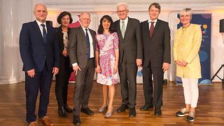 Die Volkshochschulen in Baden-Württemberg, darunter die Volkshochschule Stuttgart, feiern in diesem Jahr ihr 100-jähriges Bestehen. Am Mittwochabend, 9. Oktober 2019, laden sie zu einer Geburtstagsfeier in den Weißen Saal des Neuen Schlosses in Stuttgart ein. Auch Landtagspräsidentin Muhterem Aras (Bildmitte) gratuliert den Bildungseinrichtungen. Zum Geburtstag gab es unter anderem ein Gespräch zum Thema „(Erwachsenen-)Bildung in der Gegenwart – für die Zukunft“ sowie verschiedene Darbietungen von Künstlerinnen und Künstlern, die mit den Volkshochschulen zusammenarbeiten. Die Festrede hielt Ministerpräsident Winfried Kretschmann.