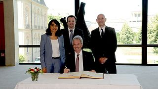 Der Präsident des Landtags von Niederösterreich, Karl Wilfing, besucht am Mittwoch, 20. Juni 2018, den Landtag von Baden-Württemberg. Nach einem Rundgang durch das Landtagsgebäude und das 2017 neu eröffnete Bürger- und Medienzentrum des Landtags wird der Gast von Landtagspräsidentin Muhterem Aras zu einem Gespräch empfangen und trägt sich in das Gästebuch ein.