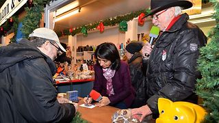 Landtagspräsidentin Muhterem Aras ist am Montag, 11. Dezember 2017, zu Gast am Stand von "Weihnachtsmann & Co." auf dem Stuttgarter Weihnachtsmarkt. Dort verkauft sie Schokolade und signiert Autogrammkarten. Mit Verkaufserlösen und Spenden unterstützt der Verein "Weihnachtsmann & Co." seit über 40 Jahren karitative Einrichtungen und Organisationen in Stuttgart und der Region.