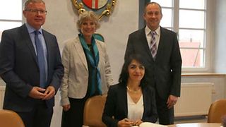 Landtagspräsidentin Muhterem Aras trägt sich ins goldene Buch der Stadt ein