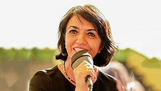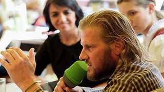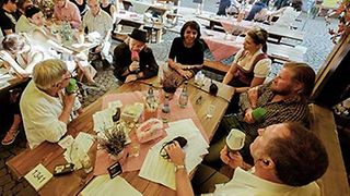 Landtagspräsidentin Muhterem Aras (3.v.li) ist am Montag, 29. August 2016, zu Gast beim Weindorf-Treff von SWR 4 und Stuttgarter Nachrichten. Weitere Gäste sind der schwäbische Mundartrocker Markus Stricker (2.v.li.), der Schauspieler und „Caveman“ Martin Luding (2.v.re.) und die Württemberger Weinkönigin Mara Walz (3.v.re.). Die Themen der Talkrunde, die von SWR4-Moderator Axel Graser (li.) und Stuttgarter Nachrichten Redakteur Tom Hörner (re.) moderiert wird, reichen von Politik über Kultur bis hin zu Musik.