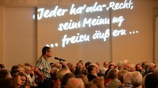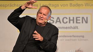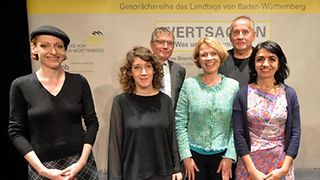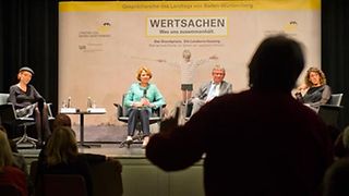 Es war dies die dritte Veranstaltung der Reihe. Im Mittelpunkt stand Artikel 5 des Grundgesetzes: „Kaum ein Artikel bietet sich für eine Diskussion mit Bürgerinnen und Bürgern so an wie dieser Artikel“, so Aras in ihrem Grußwort. Und es gebe wohl kaum einen geeigneteren Ort, über Meinungsfreiheit zu reden, sagte die Parlamentspräsidentin. „Das Grundgesetz stellt an die Bürgerinnen und Bürger bewusst keine Ansprüche. Aber seine Werte zu leben, sie im permanenten gesellschaftlichen Gespräch auszuhandeln und zu festigen - diese Verantwortung liegt bei uns allen.“ Auf dem Podium diskutierten unter Moderation von Silke Gmeiner (SWR) die Schriftstellerin Lena Gorelik, die Comic-Zeichnerin und Künstlerin Katharina Greve sowie der langjährige ARD-Korrespondent für den Nahen und Mittleren Osten, Jörg Armbruster. Dieser warnte in seinem Kurzvortrag zuvor, „mit der Meinungskeule zu schwingen“ statt zu diskutieren, denn diese Keule treffe die Meinungsfreiheit selbst. Und: Meinungsfreiheit müsse immer wieder neu verteidigt und ausgehandelt werden. „Kein Recht auf Meinungsfreiheit ohne Verantwortung“, so Gorelik. Greve schlug – analog zu den Leserbriefen von früher - ein „Porto“ für jeden Facebook-Post vor, um die Hemmschwelle zu erhören. „Das wichtigste Schulfach sollte der Umgang mit sozialen Medien sein“, fand Gorelik. Der alte Journalisten-Merksatz „überprüfe Deine Quellen“ gelte heute für jeden Internet-Nutzer. Am Ende war es an dem Kabarettisten Matthias Deutschmann, die Idee hinter der „Wertsachen“-Reihe auf den Punkt zu bringen: „Zeigen, dass das Parlament wieder zu alter Stärke zurückfindet und mit der Macht des Wortes die Standpunkte auszuhandeln.