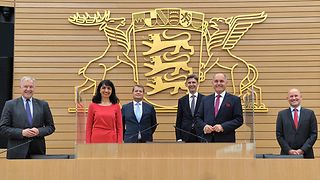 Landtagspräsidentin Muhterem Aras (2.v.l.) und Berthold Frieß, Direktor beim Landtag (r.), führen Nationalratspräsident Wolfgang Sobotka (2.v.r.) durch den Plenarsaal. Ihn begleiten Dr. Martin Eichtinger (l.), Generalkonsul Josef Saiger (3.v.l.) sowie Botschafter Dr. Peter Huber (3.v.r.).