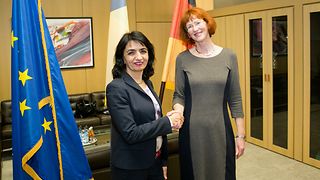 Die Präsidentin des Oberlandesgerichts Stuttgart (OLG), Cornelia Horz (rechts), kommt am Donnerstag, 15. März 2018, zu ihrem Antrittsbesuch in den Landtag von Baden-Württemberg. Sie wird von Landtagspräsidentin Muhterem Aras zu einem Gespräch in ihrem Amtszimmer empfangen.