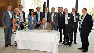 Unser Foto zeigt den Präsidenten des Flämischen Parlaments, Jan Peumans, beim Eintrag ins Gästebuch, zusammen mit Landtagspräsidentin Muhterem Aras (4. v. l.) sowie den Delegationsmitgliedern aus Flandern, Abgeordneten des Landtags von Baden-Württemberg sowie Vertretern aus Stuttgart und Karlsruhe.