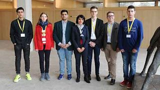 Die Gewinner (v.li.n.re.) gemeinsam mit Landtagspräsidentin Muhterem Aras (Bildmitte): Ali Saad, Melissa Nollert, Muhammad Taha Tariq, Felix Maier, Noel Treffinger und Adnan Ademaj