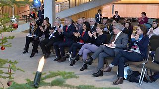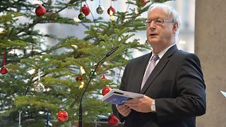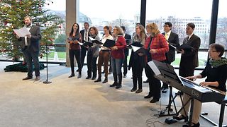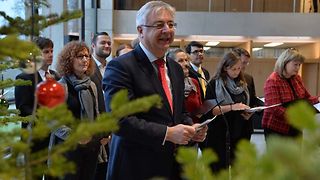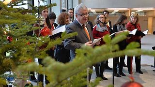 Weihnachtliche Atmosphäre herrscht am Mittwochmorgen, 20. Dezember 2017, kurz vor der letzten Parlamentssitzung in der Lobby im Haus des Landtags. Bevor der Doppelhaushalt beschlossen wird, finden Politik, Verwaltung und Kirchenvertreter zum weihnachtlichen Singen unterm Weihnachtsbaum zusammen. Ungeahnte Talente zeigen sich wie der Abgeordnete Alex Maier, der das Stück "Shepards Run“ als Solist begleitet. Der Landtagschor unter der Leitung von Angelika Rau-Čulo schafft mit „Ich steh an deiner Krippe“ und „Virgin Mary had a baby boy“ weitere stimmungsvolle Momente. Gemeinsam singen Chor und Gäste, darunter auch Landtagspräsidentin Muhterem Aras, „Tochter Zion“ und den Weihnachtsklassiker schlechthin „Oh, Du Fröhliche“. Zwischen der Musik sorgen die heiter-besinnlichen Geschichten, vorgetragen von Kirchenrat Volker Steinbrecher, Pfarrer Dr. Gerhard Neudecker und Freiherr von Eyb MdL, für Schmunzeln. Zeit, so Neudecker ernsthafter mit Blick auf die kommenden Festtage, könne man nicht verlängern, nur vertiefen.