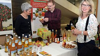 „Naturschutz und der Erhalt der Kulturlandschaften steht bei Ihnen an erster Stelle“, so Landtagspräsidentin Muhterem Aras in ihrem Grußwort anlässlich der Präsentation und Verkostung der Streuobst-Initiative Calw-Enzkreis-Freudenstadt im Haus des Landtags am Mittwoch, 10. Mai 2017. „Die hochstämmigen Streuobstwiesen hier im Ländle sind ein Schatz für uns alle. Sie sind Paradiese aus zweiter Hand. Wir haben die Verantwortung, dieses Kulturgut mit seinen über 5.000 Tier- und Pflanzenarten zu erhalten“, betont Aras. Die Aktion steht im Rahmen der zeitgleich stattfindenden länderübergreifenden Streuobsttage. Sie soll die Wertschätzung des Landes für Streuobstwiesen widerspiegeln. Im Foyer haben Besucherinnen und Besucher die Möglichkeit, sich durch einen repräsentativen Querschnitt vielfältiger Produkte zu probieren.