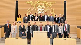 Tunesien möchte seine Gebietskörperschaften stärken und den Bürgerservice ausbauen. Der dafür notwendige Umbau der nationalen Administration geht mit einer umfassenden Dezentralisierungsreform einher. Angehende Verwaltungsbeamte sind derzeit im Rahmen des Deutsch-Tunesischen Verwaltungsaustausches in Baden-Württemberg und besuchen am Donnerstag, 9. Mai 2019, den Landtag. Begrüßt werden sie von Direktor Berthold Frieß (oben, 4. v. re.), der den Gästen die Aufgaben des Landtags und der Landtagsverwaltung erläutert. Nach einer kurzen Landtags-Führung mit dem Besucherdienst, stellt Doris Beck (unten, 2. v. li.), Projektleiterin GIZ, die Arbeit der Deutschen Gesellschaft für Internationale Zusammenarbeit vor. Daran anschließend erläutern die tunesischen Teilnehmenden ihre Ziele und Erwartungen an den Austausch. Anschließend gibt es ein Treffen mit Landtagsabgeordneten, bei der die Gäste die Möglichkeit haben, Fragen zu stellen.