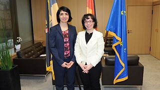 Die Konsulin der Tunesischen Republik in München, Soumaya Zorai Chaabani (re.), kommt am Dienstag, 31. Januar 2017, zu ihrem Antrittsbesuch in den Landtag von Baden-Württemberg. Sie wird dort von Landtagspräsidentin Muhterem Aras (li.) zu einem Gespräch in ihrem Dienstzimmer empfangen. Die Konsulin betreut seit Dezember 2016 die Bundesländer Bayern und Baden-Württemberg.