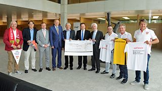 Einen Scheck in Höhe von 20 000 Euro übergibt am Donnerstag, 20. Juli 2017, der Landtagsfanclub des VfB Stuttgart an Vertreter aller drei Fußballverbände zugunsten der Behindertenauswahl des Landes. Diese gibt es seit 2013. Das Geld geht in den Aufbau regionaler Stützpunkte – neben Ravensburg, Heilbronn und Reutlingen soll Freiburg an den Start gehen. Rund 25 junge Erwachsene zwischen 17 und 25 Jahren spielen in der Inklusions-Landesauswahl. Dies durchaus erfolgreich: Zuletzt erzielte der BW-Kader den 4. Platz bei den Deutschen Meisterschaften.