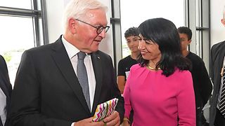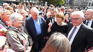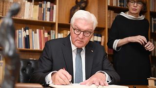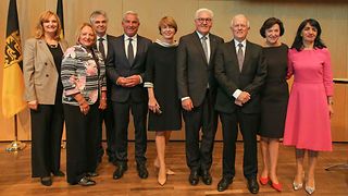 Mit einem Festakt im Stuttgarter Rathaus an dem auch Landtagspräsidentin Muhterem Aras (re.) teilnimmt, wird am Donnerstag, 12. September 2019, an das erste Staatsoberhaupt Deutschlands, Theodor Heuss, gedacht. Vor genau 70 Jahren war er zum ersten deutschen Bundespräsidenten gewählt worden. Bundespräsident Frank-Walter Steinmeier (4. v. re.) würdigte Heuss' Verdienste in den Aufbaujahren der Bundesrepublik. Heuss habe seine ganze Kraft eingesetzt, um die Deutschen an die neuen demokratischen Zustände zu gewöhnen, ihnen eine zivile Liberalität vorzuleben, so Steinmeier. Heuss war von 1949 bis 1959 Staatsoberhaupt.