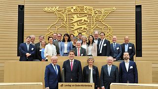 Am Dienstag, 14. Mai 2019, besucht eine Delegation des Vorarlberger Landtags unter Leitung von Landtagspräsident Mag. Harald Sonderegger den Landtag von Baden-Württemberg. Im Anschluss an ein Gespräch mit Mitgliedern des baden-württembergischen Europaausschusses unter seinem Vorsitzenden Willi Stächele sowie einer Führung durch das Bürger- und Medienzentrum und das Landtagsgebäude werden die Gäste im Plenarsaal des Landtags von Präsidentin Muhterem Aras begrüßt. Der Vorarlberger Landtagspräsident Mag. Harald Sonderegger erwidert die Begrüßung am Rednerpult des Landtags und bedankt sich herzlich für die Einladung.