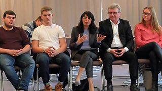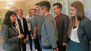 Am 65. Jahrestag der Landesverfassung, dem 19. November, traf Landtagspräsidentin Muhterem Aras im „Haus auf der Alb“ mit Jugendlichen der Georg-Goldstein-Schule zusammen. Die Gespräche im Tagungszentrum der Landeszentrale für Politische Bildung (LpB) drehten sich um Grundrechte, wie sie Grundgesetz und Landesverfassung mit ihren 94 Artikeln behandeln wie zum Beispiel Artikel 11 (LV), der jedem jungen Menschen ohne Rücksicht auf Herkunft oder wirtschaftliche Lage das Recht auf eine der Begabung angemessene Erziehung und Ausbildung einräumt. Oder das Recht auf Heimat, das die Landesverfassung seinen Bürgerinnen und Bürgern einräumt. Die Schülerinnen und Schüler der Berufsschule hatten sich in Vorbereitung auf diesen Geburtstagstermin intensiv mit dem Thema befasst und eine „Expertengruppe Landtag und Verfassung“ gegründet. Präsidentin Aras appellierte bei der Gelegenheit an die Jugendlichen: „Gehen Sie kommendes Jahr zur Wahl! Engagieren Sie sich in der Kommune und für unser einzigartiges Friedensprojekt Europa!“