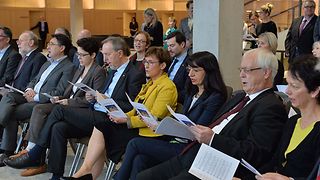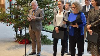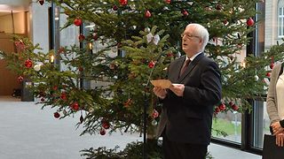 Zum „stimmungsvollen Singen unterm Weihnachtsbaum“ treffen sich am letzten Plenartag des Jahres 2019 Abgeordnete aller Fraktionen, Mitarbeiterinnen und Mitarbeiter der Landtagsverwaltung, Landtagspräsidentin Muhterem Aras und Vizepräsidentin Sabine Kurtz. Der Landtagschor unter neuer Leitung von Claudia Burckhardt umrahmt die festliche Einstimmung und stützt das gemeinsame Singen von "Tochter Zion" oder "Oh, Du Fröhliche" mit seinen geschulten Stimmen. Es werden mehrere weihnachtliche, zumeist heitere Kurzgeschichten vorgetragen, durch den CDU-Abgeordneten Arnulf Freiherr von Eyb („Die Gratulation“), den evangelischen Pfarrer Volker Steinbrecher („Als Gott eine Frau fand“) sowie den katholischen Pfarrer Gerhard Neudecker („Geschenkte Gedanken zum Stall als nicht kindgerechtes Biotop“). Pfarrer Neudecker vom Katholischen Büro Stuttgart, das als Kontaktstelle auch zum Landtag fungiert, erinnert an die in ganz Baden-Württemberg verbreitete Aktion zum Singen und Musizieren in der Adventszeit (www.adventsmusik-bw.de).