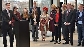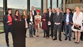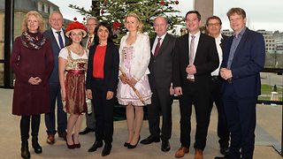 „Die Wurzeln unserer Landtagsweihnacht liegen im Schwarzwald. Seit 17 Jahren bescheren uns Gemeinden aus dieser Region mit ihren Bäumen“, freut sich Landtagspräsidentin Muhterem Aras anlässlich der traditionellen Weihnachtsbaumübergabe von Vertreterinnen und Vertretern des Zollernalbkreises, der Gemeinde Enzklösterle, der Stadt Bad Wildbad und der Gemeinde Höfen, am Mittwoch, 13. Dezember 2017, im Landtag von Baden-Württemberg. Religiöses Fest, Familienfest, Brauchtum in unterschiedlichen Kulturen - Weihnachten sei ein Fest der Vielfalt, so Aras bei der Übergabe des Baumes. "Weihnachten hat viele Aspekte." Der Landtagschor unter der Leitung von Angelika Rau-Čulo sorgt für die stimmungsvolle, musikalische Umrahmung. Das Gruppenbild zeigt (v. li. n. re.): Bürgermeisterin Petra Nych (Enzklösterle), Thomas Blenke MdL, Heidelbeerprinzessin Hanna Winz, stellv. Bürgermeister Hartmut Koch (Höfen), Landtagspräsidentin Muhterem Aras, Waldkönigin Ramona Rauch, Vizepräsident Wilfried Klenk, Bürgermeister Klaus Mack (Bad Wildbad), Klaus Dürr MdL und Landrat Günther-Martin Pauli (Zollernalbkreis).